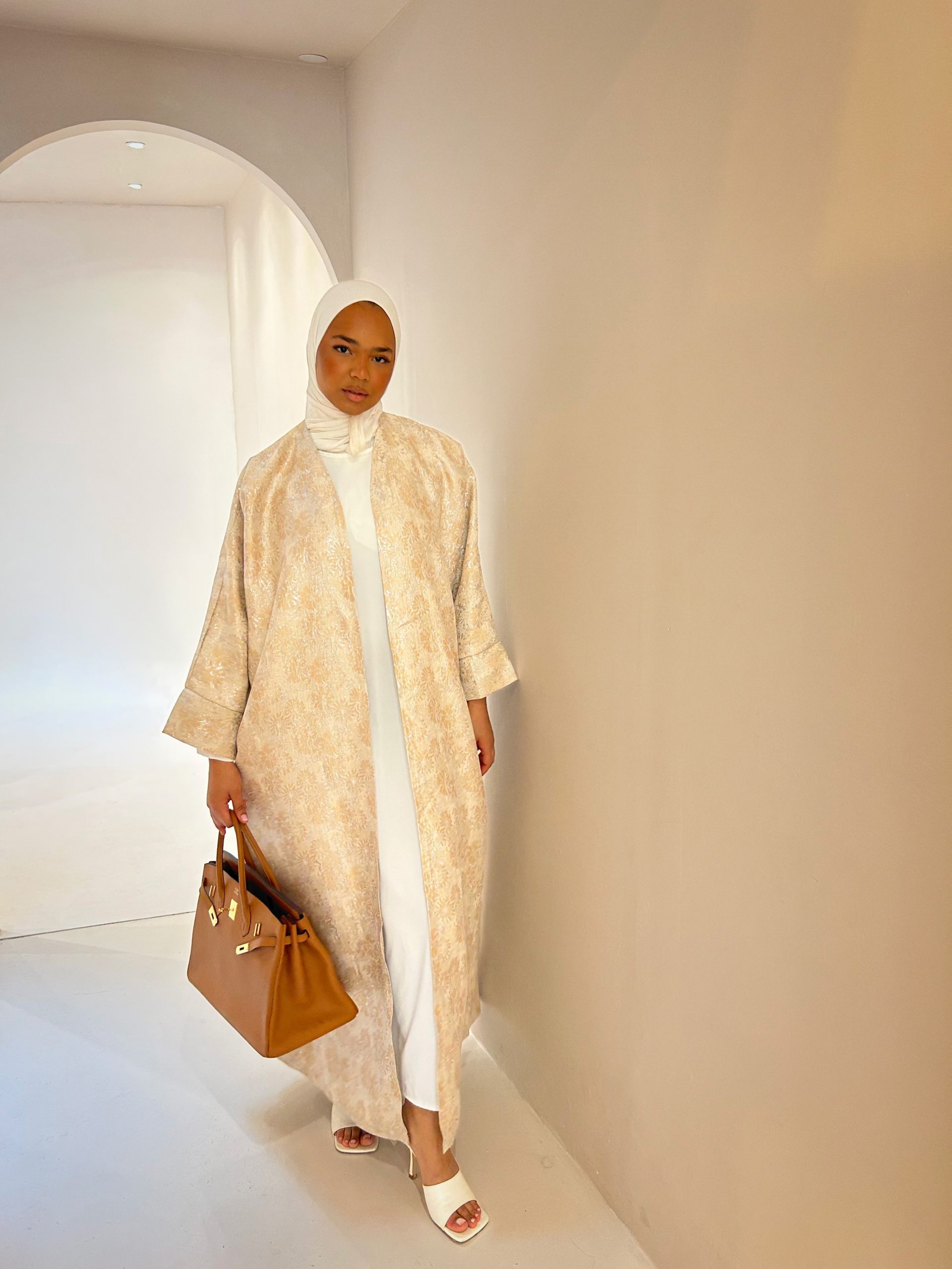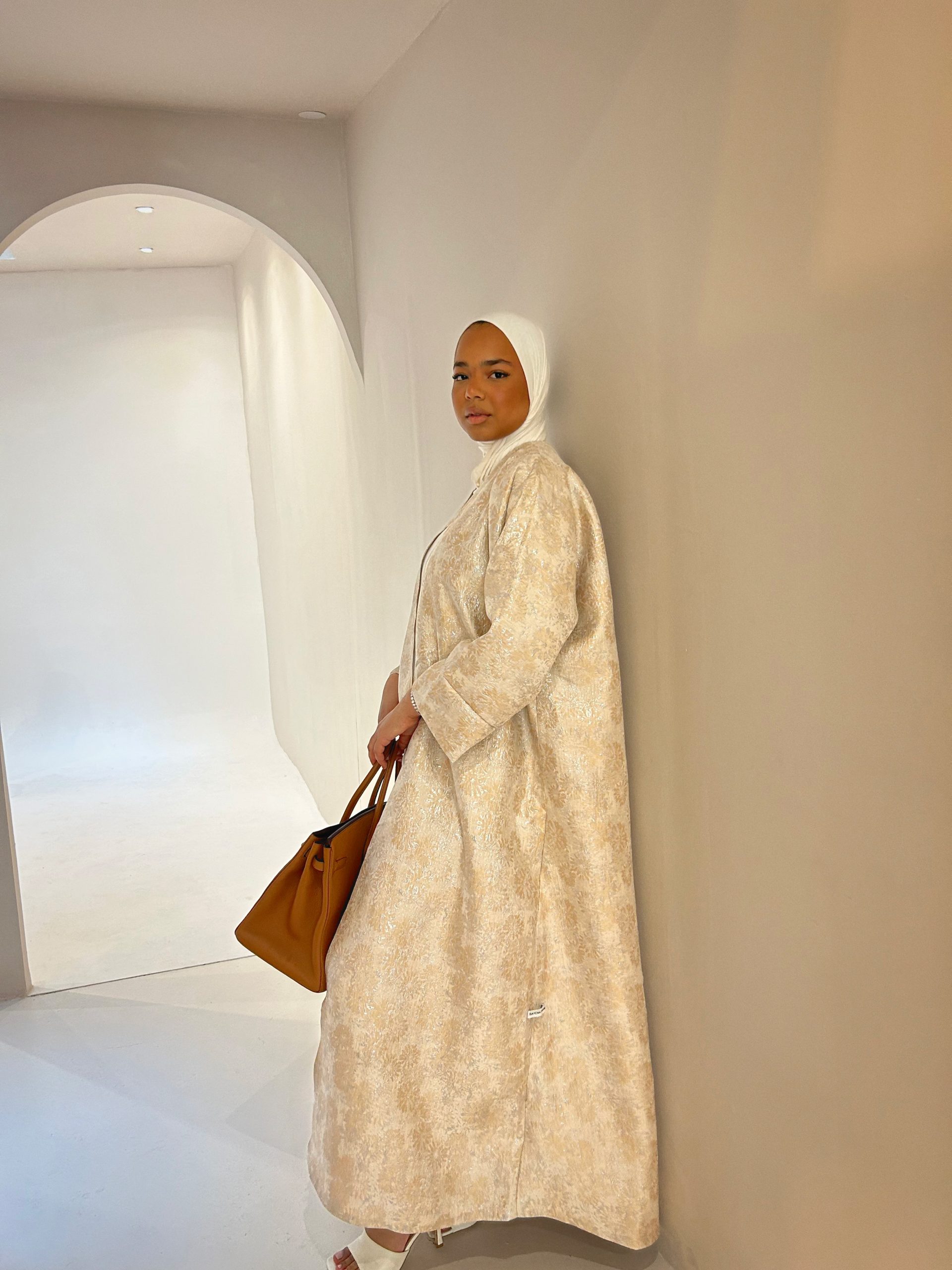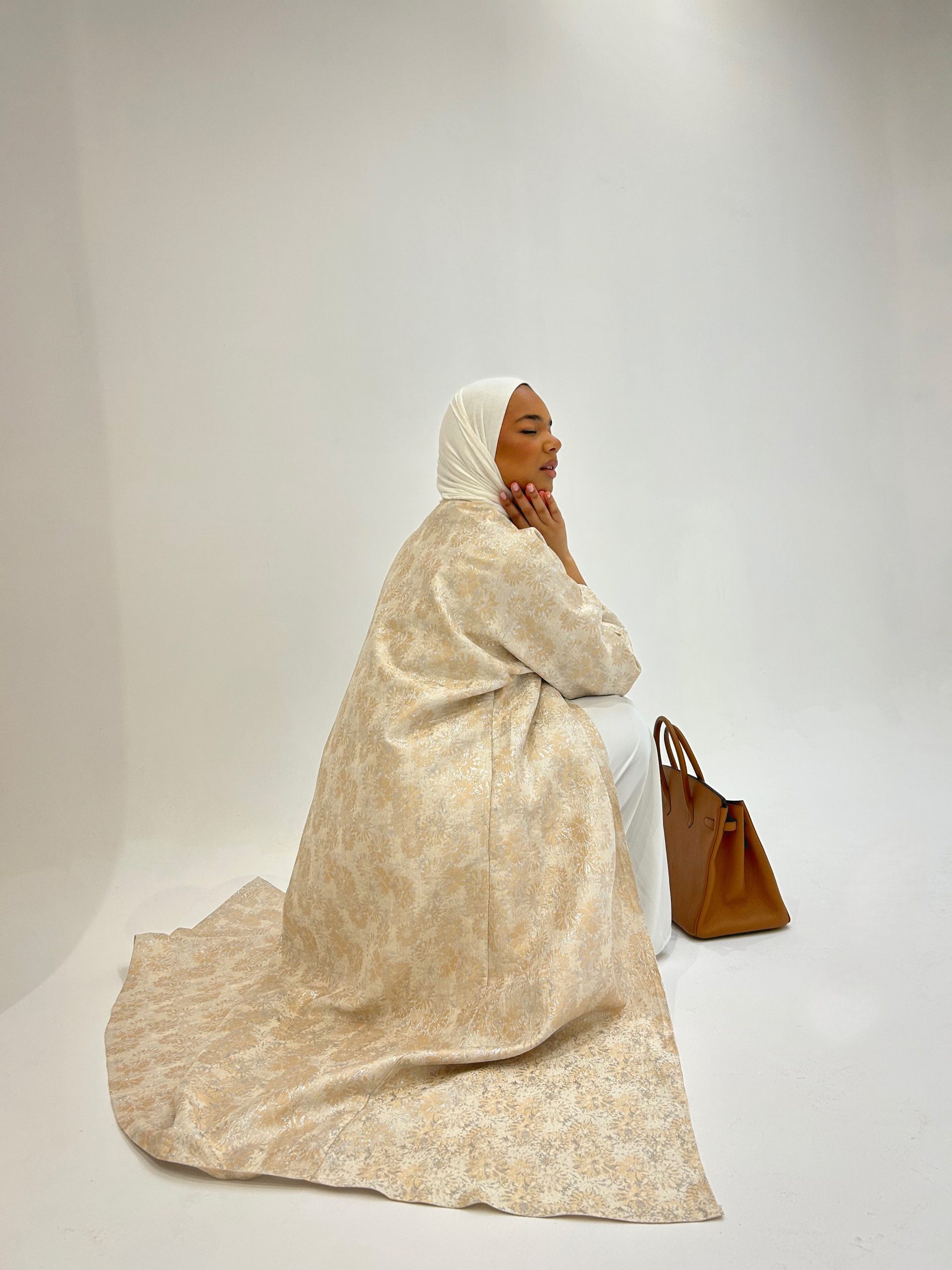 Long kimono coupe ample et oversize au tissus brocart couleur beige