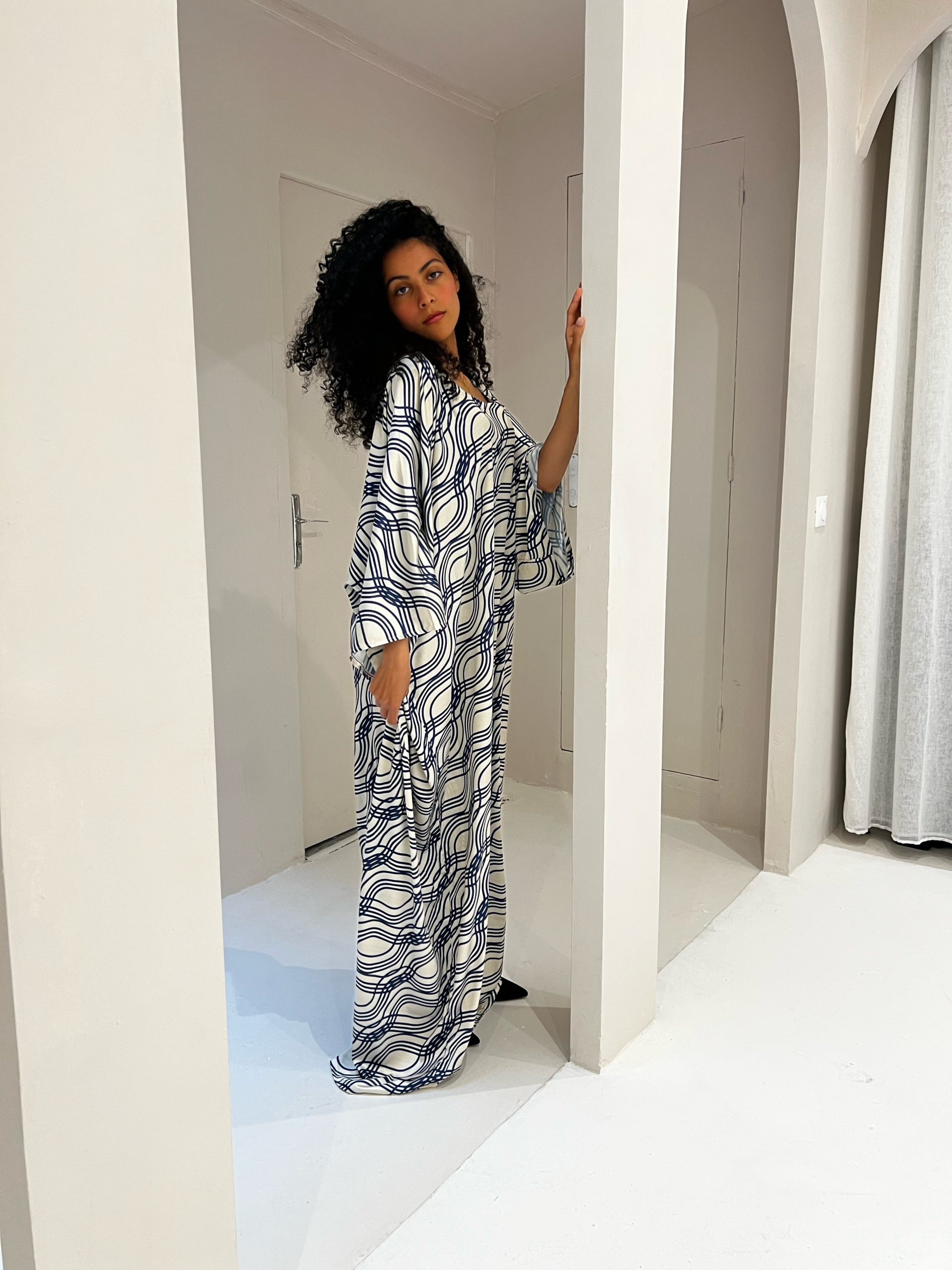 Robe longue, ample avec des manches longues. Tissus en soie à motif de couleur bleu et blanc